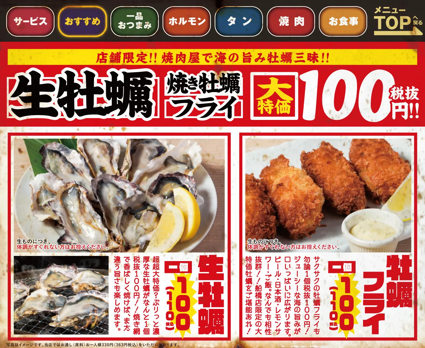 - 全90品【牡蠣&ホルモン食べ放題コース】噛むほど旨い仙台流ホルモン!90分2999円(税込3299円)- 「酒・料理が足りない!」などの心配無用!ぷりっぷり牡蠣&名物ホルモン、W濃厚を食べ尽くせ♪旬の牡蠣・塩ホルモン・焼肉・サイドメニューまで全部食べ放題!さらにソフトドリンク飲み放題付きで⇒驚愕の2,999円と鬼コスパ♪今なら+500円で「0秒レモンサワー」と、日本酒&ドリンク&アイスクリームBARも追加OK♪ - 3,299円(税込) 詳細・予約 - 全90品【牡蠣&ホルモン食べ放題コース】噛むほど旨い仙台流ホルモン!90分2999円(税込3299円)- 3,299円(税込)