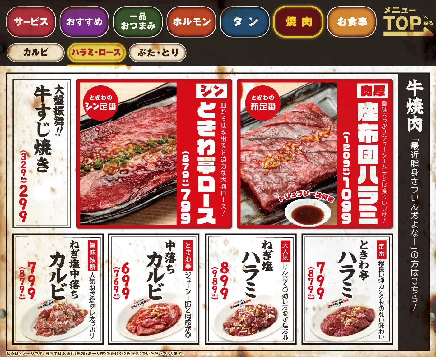 迷ったらコレ!こだわりの「中落ちカルビ」や「旨とろ炙りカルビ」など大人気カルビづくし! 〆にもアテにもぴったりな牛たんカレーはときわ亭の隠れた逸品♪ 大満足食べ飲み放題コースです!更に生ビールやハイボール、チャミスル、0秒レモンサワーまで全種類飲み放題付き♪ ※食べ放題・飲み放題80分制/お席100分制(フードL.O.23:00/ドリンクL.O.23:30)