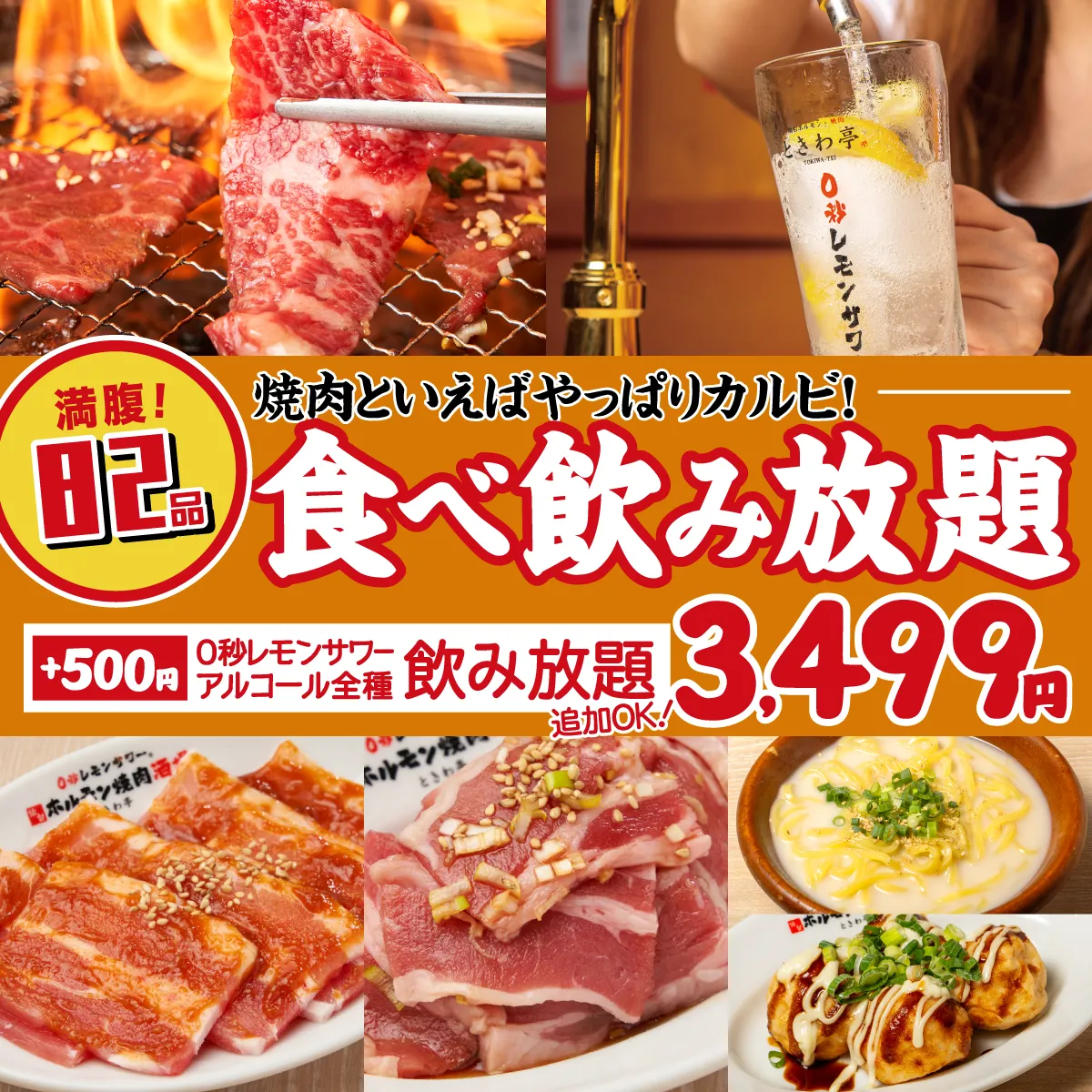 「酒・料理が足りない!」などの心配無用!ときわ亭名物 塩ホルモン・焼肉・サイドメニューまで全部食べ放題!さらにソフトドリンク飲み放題も付いて、驚愕の⇒2,499円と鬼コスパ♪今なら+500円で「0秒レモンサワー飲み放題」&アルコール飲み放題も追加OK!!