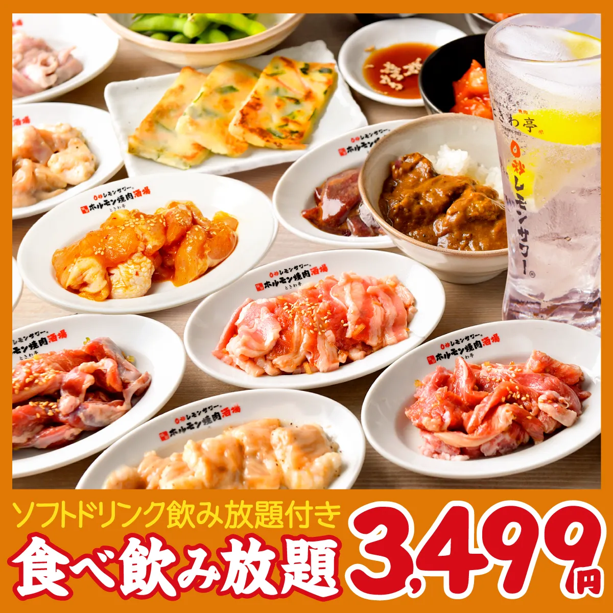 「酒・料理が足りない!」などの心配無用!ときわ亭名物 塩ホルモン・焼肉・サイドメニューまで全部食べ放題!さらにソフトドリンク飲み放題も付いて、驚愕の⇒2,499円と鬼コスパ♪今なら+500円で「0秒レモンサワー飲み放題」&アルコール飲み放題も追加OK!!