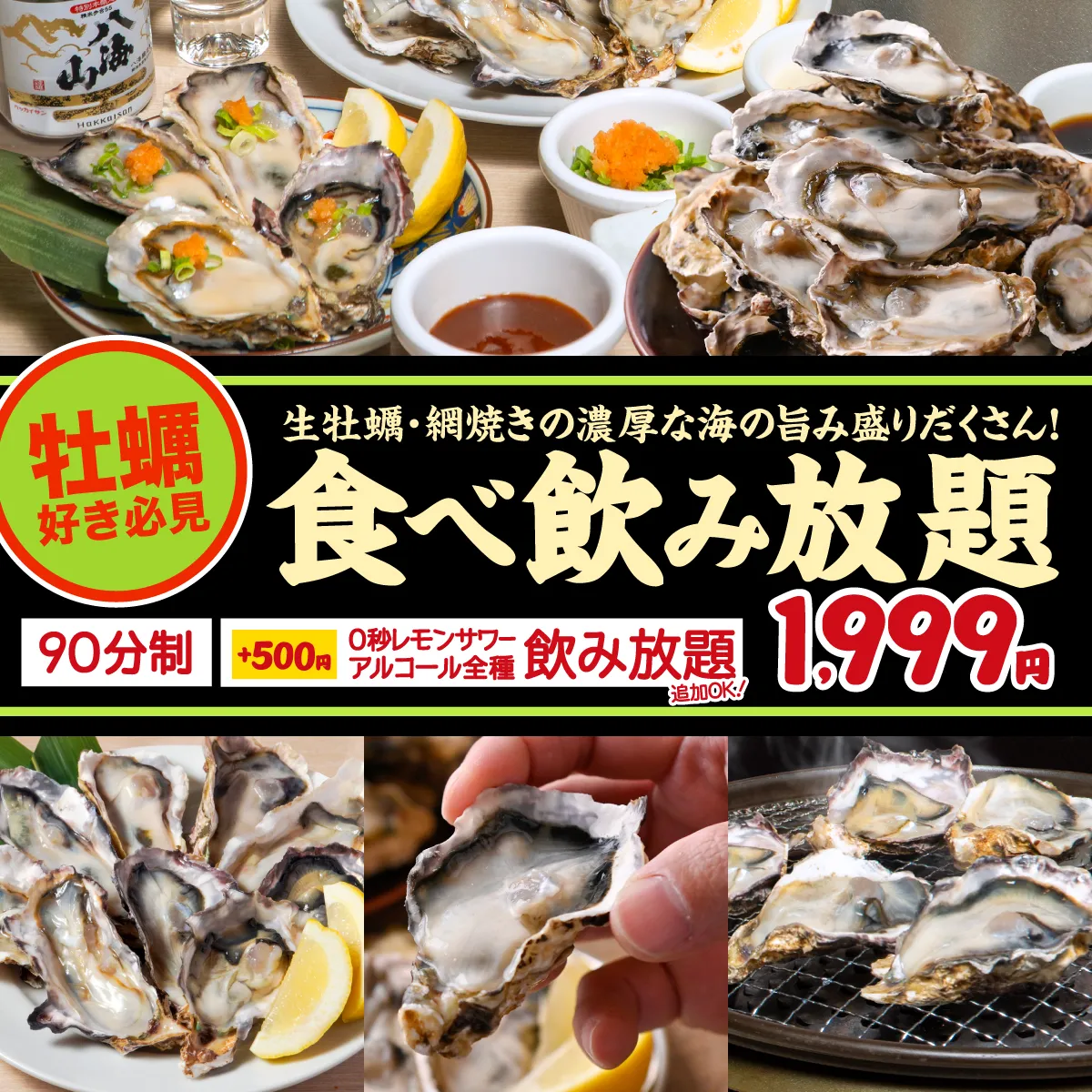 牡蠣好き必見◎旬の生牡蠣、焼き牡蠣が90分食べ放題♪ぜ~んぶ、何個食べても1,999円と高コスパ!!なんと嬉しいソフトドリンク飲み放題付き♪+500円で「0秒レモンサワー飲み放題」&アルコール飲み放題も追加OK!!