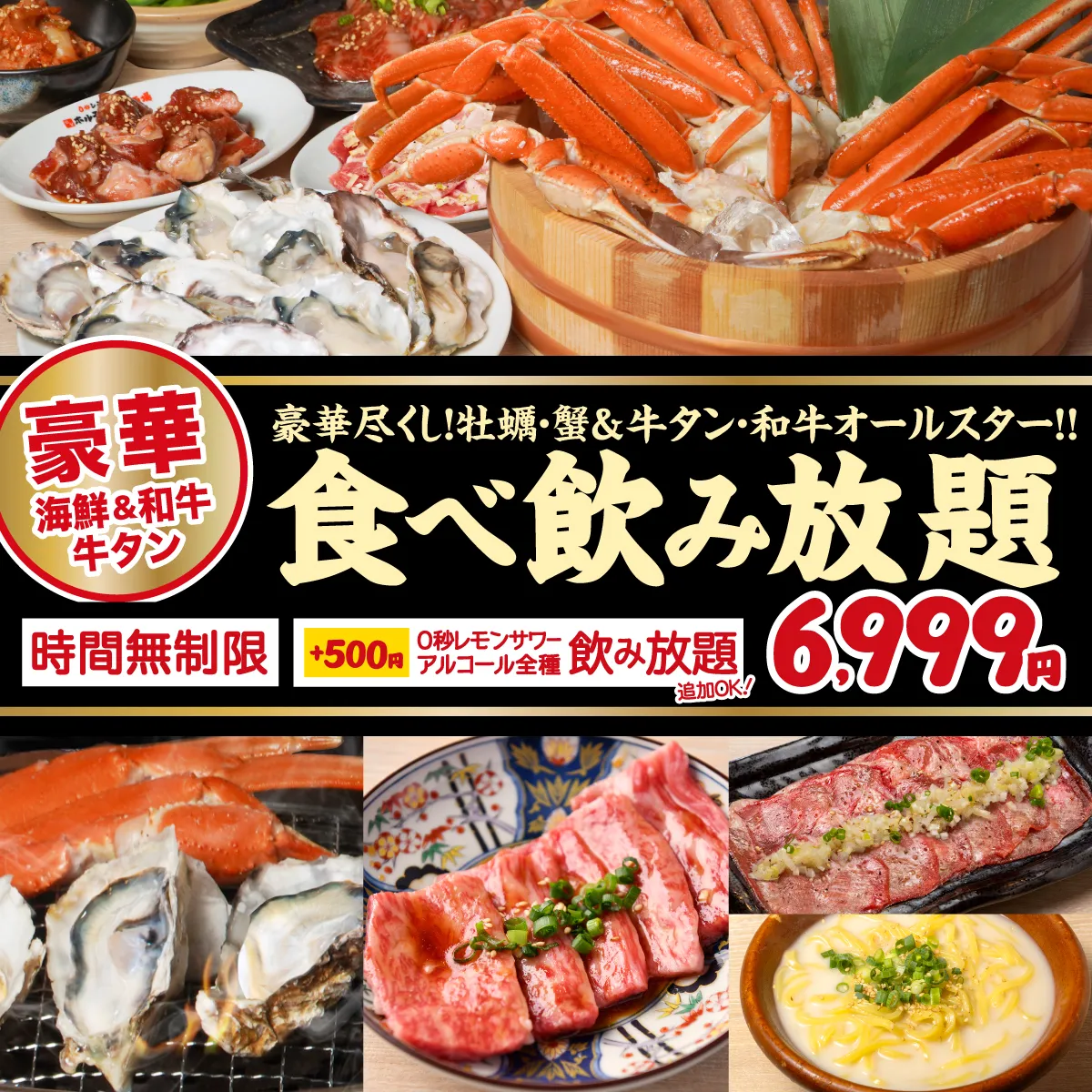 黒毛和牛×牡蠣×牛タン×蟹!豪華食材が勢ぞろいの至高の食べ放題プラン!時間無制限で、極上の海鮮と和牛の共演を心ゆくまで堪能いただけます。さらに+500円で「0秒レモンサワー飲み放題」&アルコール飲み放題も追加OK!