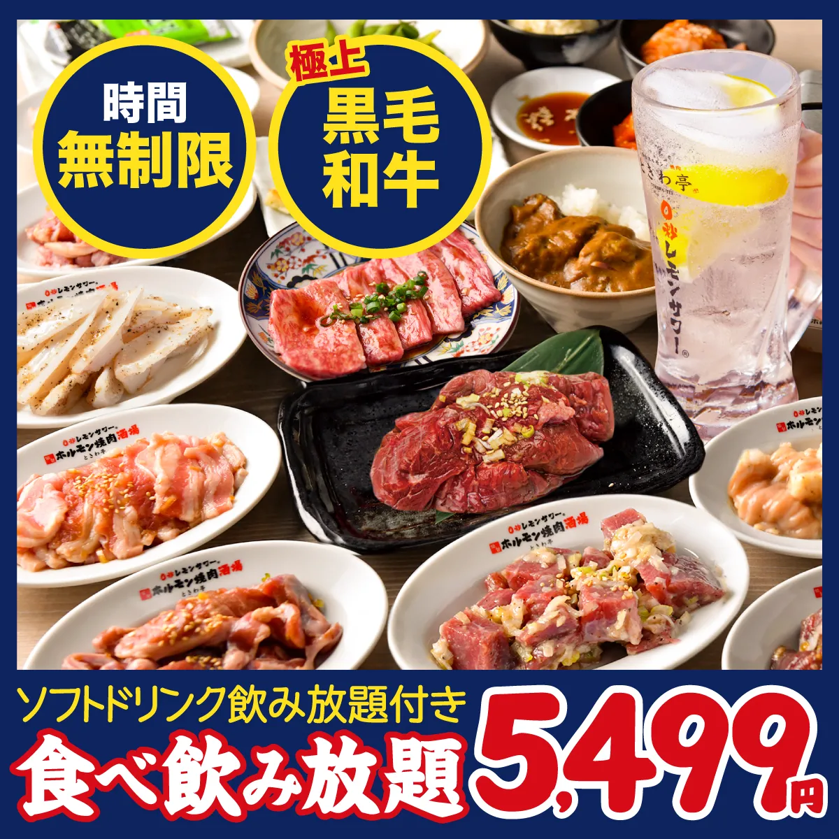 人気No,1!ときわ亭でしか食べられないオリジナルメニューをはじめ、本場仙台の味を時間を気にせず、心ゆくまで楽しめる”時間無制限”の食べ放題&ソフトドリンク飲み放題プラン!今ならホルモン、焼肉、人気サイドメニューが食べ放題◎+500円で「0秒レモンサワー飲み放題」&アルコール飲み放題も追加OK!!