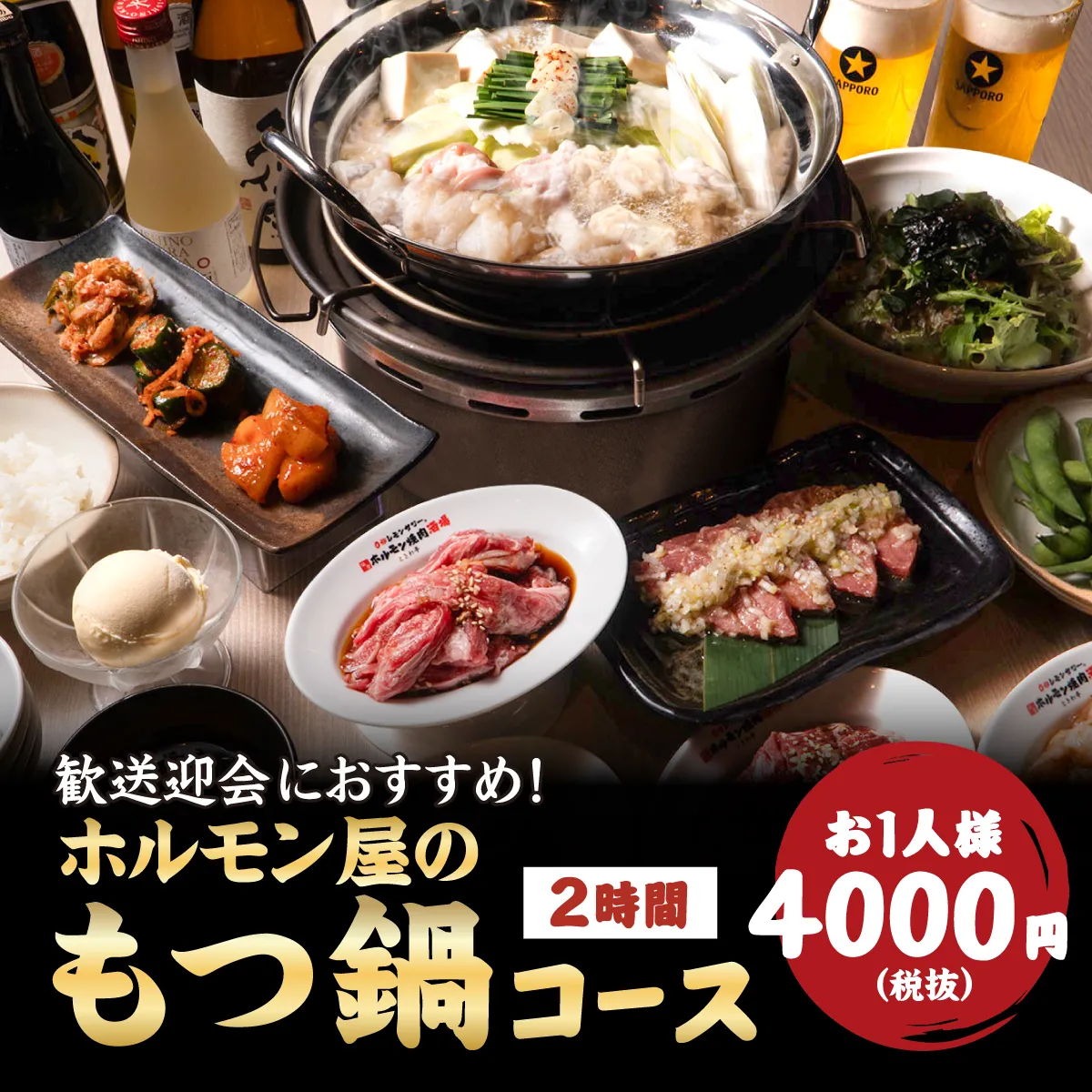 深夜0時以降のご予約はこちら!【ホルモン屋のもつ鍋コース】絶品もつ鍋 +名物から希少部位まで豪華11品!2時間飲み放題付5000円(税込5500円)