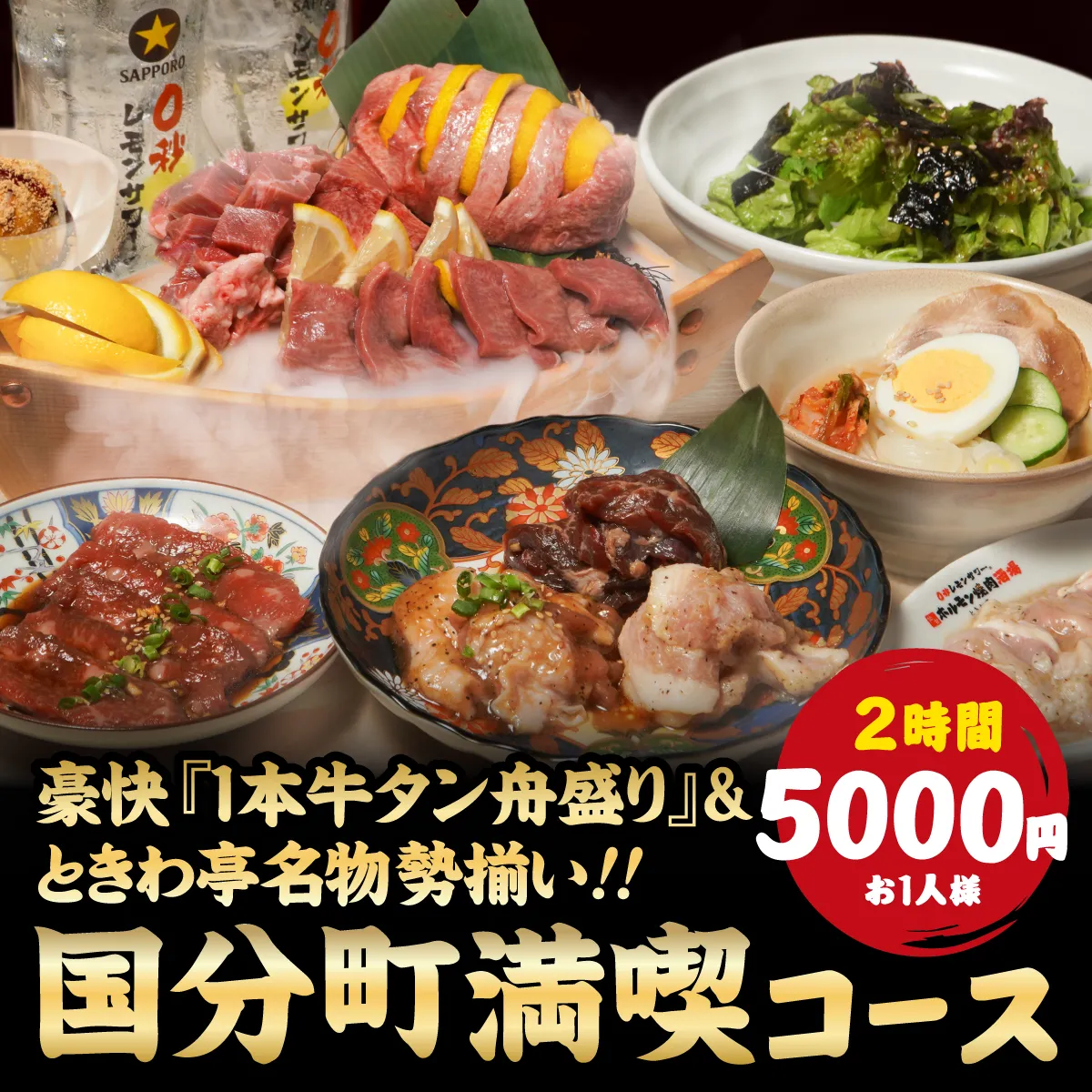 リニューアル記念!ときわ亭国分町店限定の特別コースが期間限定で登場。豪快な『1本牛タン舟盛り』をはじめ、名物仙台ホルモンや黒毛和牛カルビまで全7品を堪能。+550円で“0秒レモンサワー”飲み放題も追加OK!