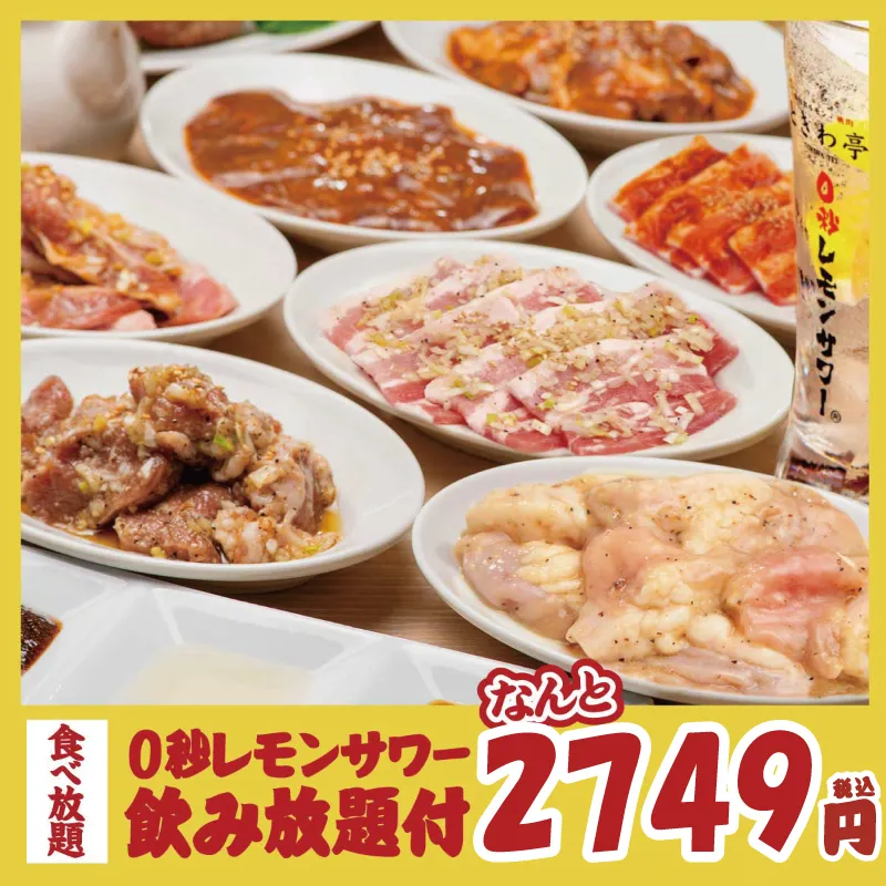 極上黒毛和牛を贅沢に食べ放題で味わえる♪上品な香りととろける食感「黒毛和牛 上カルビ」や人気の「ときわ亭牛タン」まで思う存分堪能できる、ときわ亭の贅を尽くした特別コースをご賞味あれ!こちらのコースでは通常90分のところ2時間制に無料延長♪もちろん当店名物『0秒レモンサワー』も飲み放題!