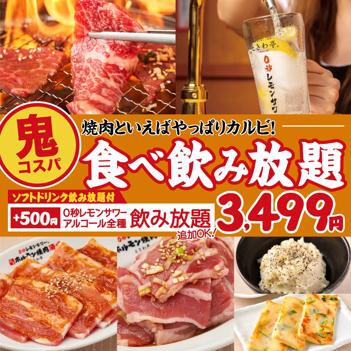 「酒・料理が足りない!」などの心配無用!ときわ亭名物 塩ホルモン・焼肉・サイドメニューまで全部食べ放題!さらにソフトドリンク飲み放題も付いて、驚愕の⇒2,499円と鬼コスパ♪今なら+500円で「0秒レモンサワー飲み放題」&アルコール飲み放題も追加OK!!