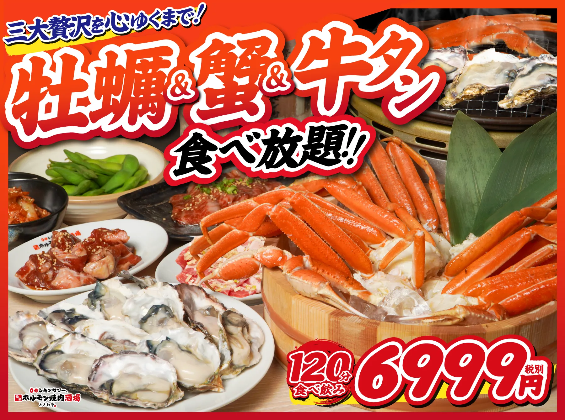 全140品【牡蠣・蟹&牛タン・和牛食べ放題コース】極上蟹三昧!120分6999円(税込7699円)