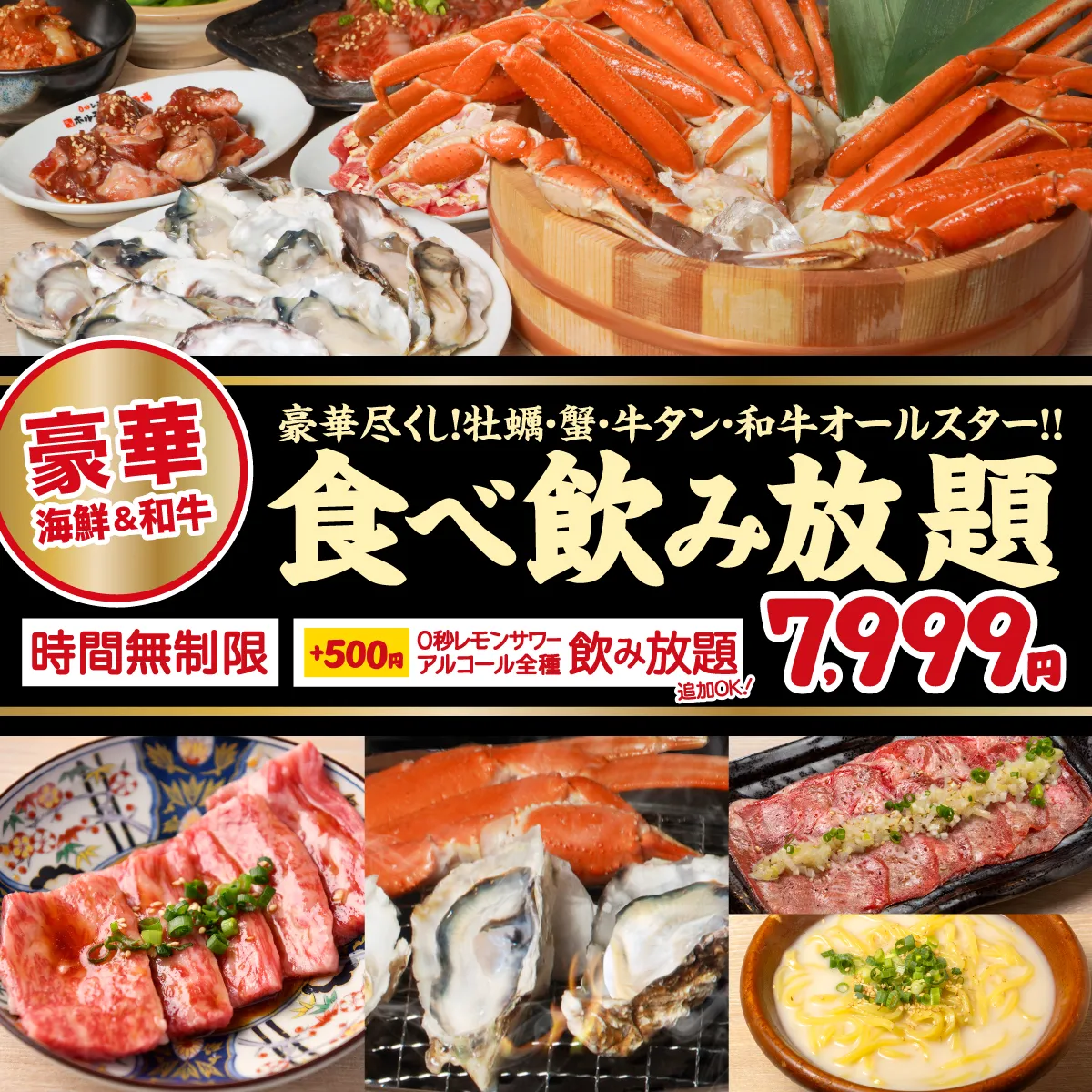 黒毛和牛×牡蠣×牛タン×蟹!豪華食材が勢ぞろいの至高の食べ放題プラン!なんと”時間無制限”!極上の海鮮と和牛の共演を心ゆくまで堪能いただけます。さらに+500円で「0秒レモンサワー飲み放題」&アルコール飲み放題も追加OK!