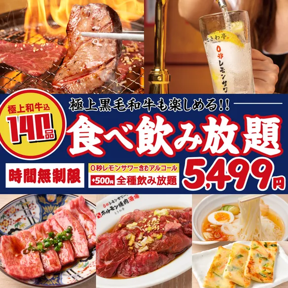 なんと「極上 黒毛和牛」が食べ放題で味わえる贅沢プラン!ハイクオリティなワンランク上の食べ放題を”時間無制限”で思う存分お楽しみいただけます。さらに+500円で「0秒レモンサワー飲み放題」&アルコール飲み放題も追加OK!!