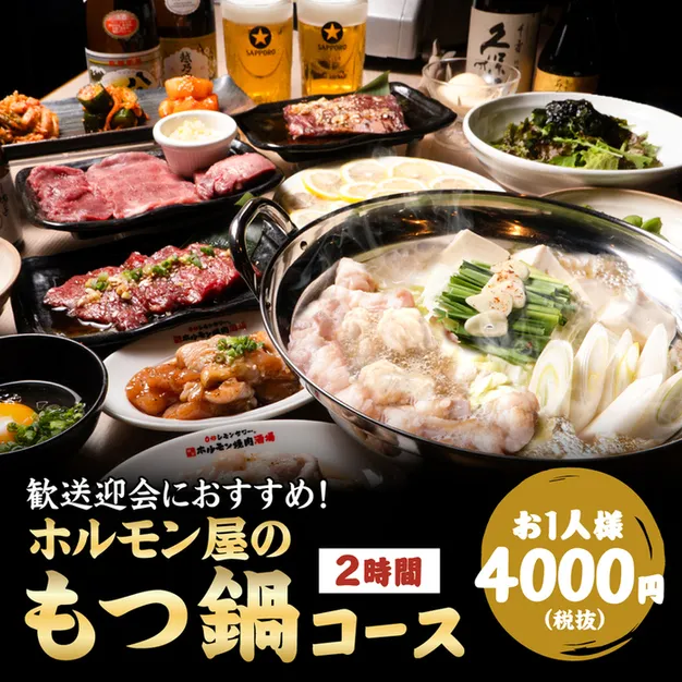 【ホルモン屋のもつ鍋コース】絶品もつ鍋 +厳選黒毛和牛を含む豪華10品!2時間飲み放題付4000円(税込4400円)