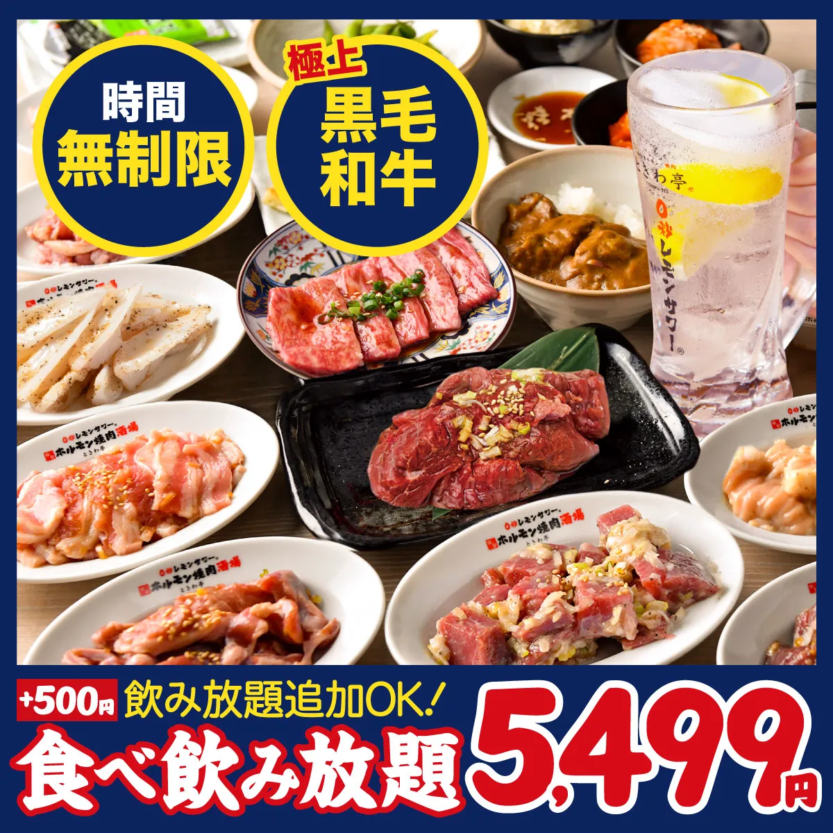 「酒・料理が足りない!」などの心配無用!ときわ亭名物 塩ホルモン・焼肉・サイドメニューまで全部食べ放題!さらにソフトドリンク飲み放題も付いて、驚愕の⇒2,499円と鬼コスパ♪今なら+500円で「0秒レモンサワー飲み放題」&アルコール飲み放題も追加OK!