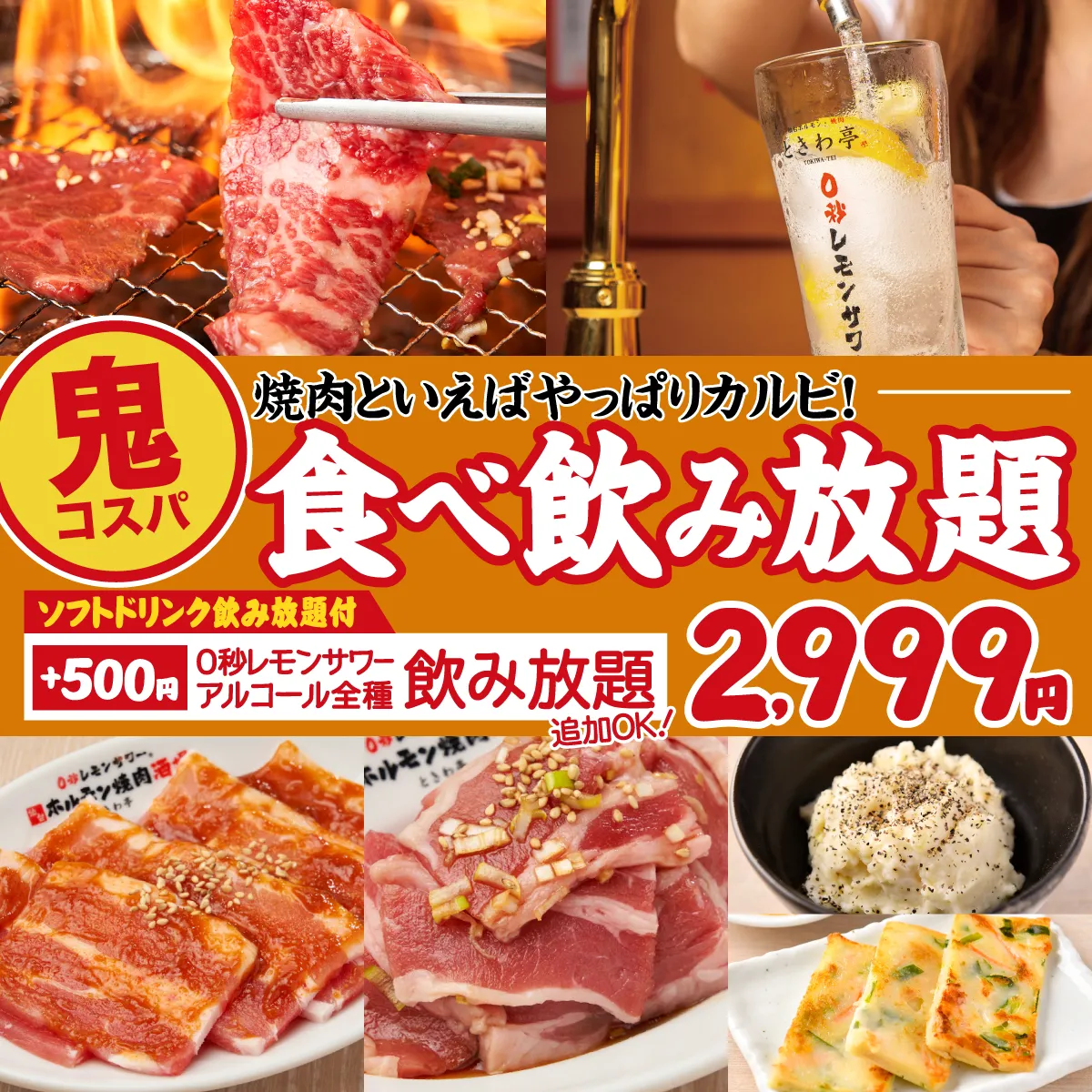 焼肉といえばやっぱりカルビ!こだわりの「旨とろ炙りカルビ」や「ねぎ塩豚カルビ」などなど絶品カルビが勢ぞろい!もちろんぜーんぶ食べ放題♪さらに「ときわ亭名物 塩ホルモン」や人気サイドメニューも食べ放題できちゃう大満足の鬼コスパ!+500円で「0秒レモンサワー飲み放題」&アルコール飲み放題も追加OK!!
